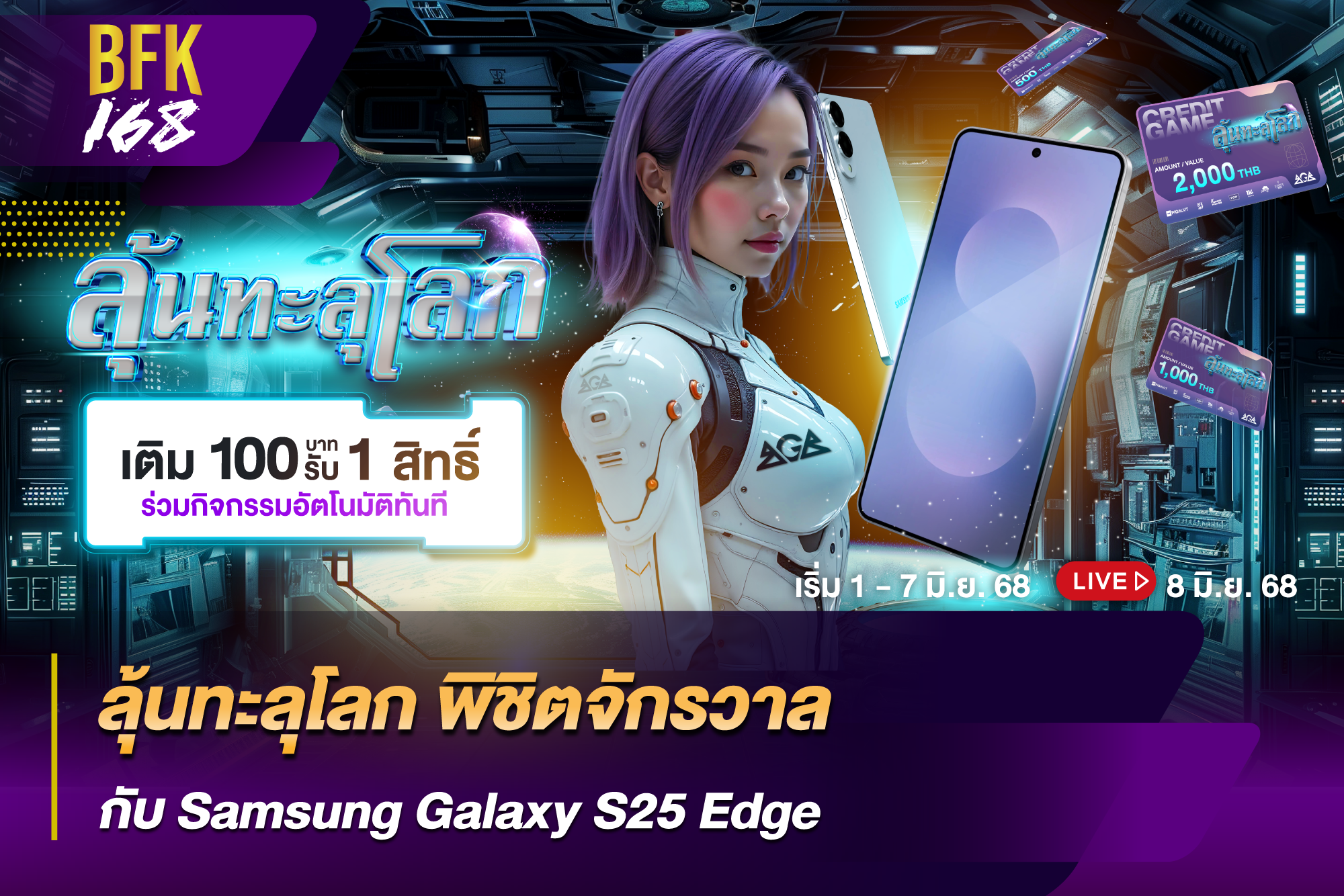 ภารกิจสุดยิ่งใหญ่แห่งปีกำลังจะเริ่มขึ้นจากโลกสู่ดวงดาว กับแคมเปญ ลุ้นทะลุโลก ที่ BFK168 พร้อมให้บรรดานักสำรวจอวกาศออกเดินทางสำรวจจักรวาลอันไร้ขีดจำกัด พร้อมลุ้นของรางวัลสุดอลังการ ไม่ว่าจะเป็น Samsung Galaxy S25 Edge มือถือสมาร์ตโฟนเรือธงน้องใหม่ล่าสุดที่กำลังมาแรงในเวลานี้ และของรางวัลเครดิตฟรีรวมมูลค่ากว่า 120,000 บาท การกลับมาของแคมเปญใหญ่นี้จะเป็นการร่วมมือของใครไม่ได้เลยนอกจาก BGB Casino ผู้ให้การสนับสนุนหลักอย่างเป็นทางการของเรา และแน่นอนว่า เฉพาะสมาชิกเว็บเกมส์ออนไลน์ในเครือทั้ง 8 เว็บไซต์ของเราเท่านั้นที่จะได้รับสิทธิ์พิเศษนี้ ได้แก่ PIGSLOT & PIGBET HungryPussy888, 918KissME, PG168, 116Lotto และ UFABET888