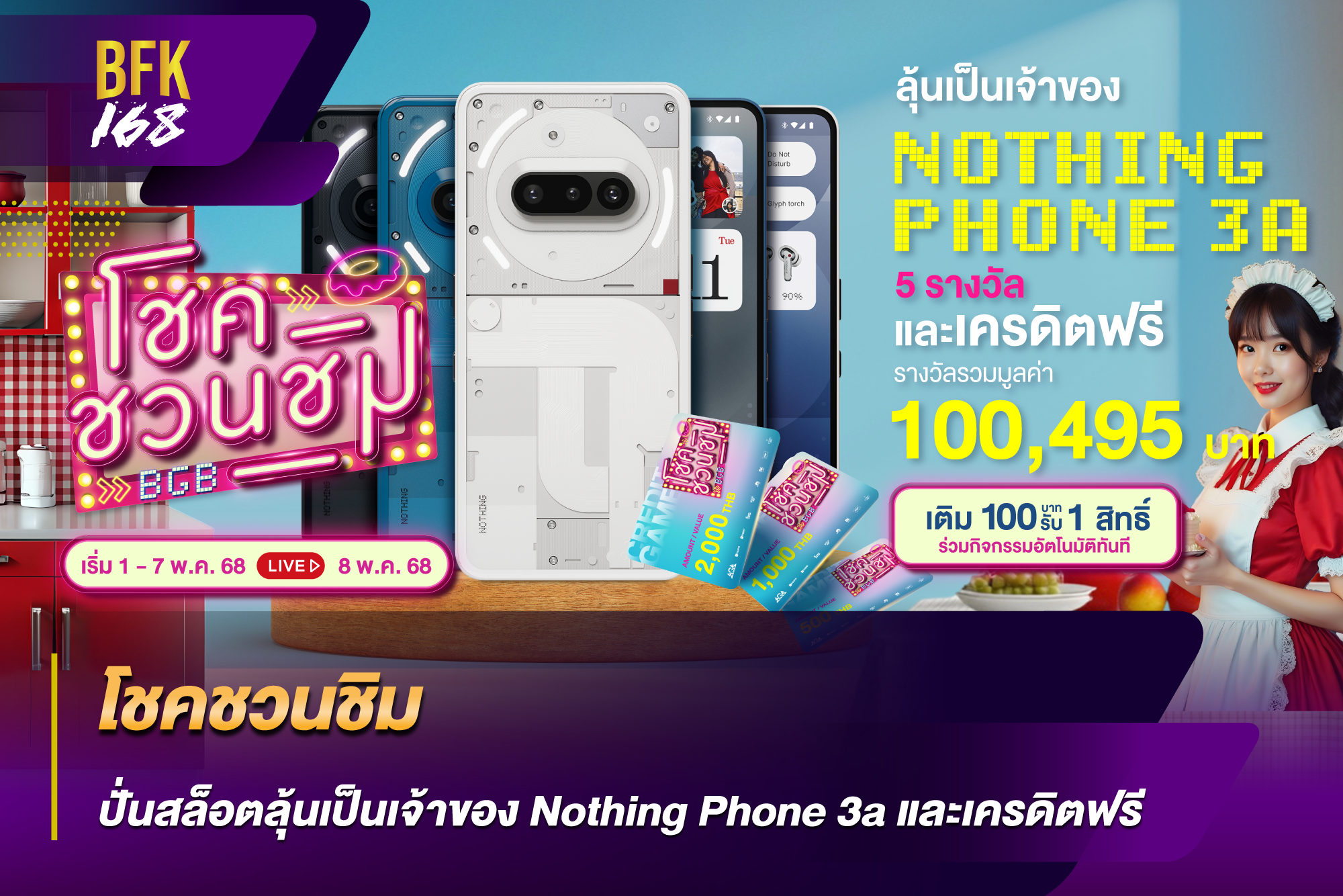 ต้อนรับเดือนพฤษภาคมด้วยแคมเปญสุดพิเศษแสนอร่อย โชคชวนชิม สนุกกับการปั่นสล็อต BFK168 พร้อมลุ้นของรางวัลสุดอลังการ ไม่ว่าจะเป็น มือถือสมาร์ตโฟน Nothing Phone 3a ที่มาพร้อมกับฟีเจอร์กล้องใหม่สุดไฮเทค และของรางวัลเครดิตฟรี รวมมูลค่ากว่า 100,495 บาท ที่ได้จับมือร่วมกันกับ BGB Casino ผู้ให้การสนับสนุนอย่างเป็นทางการ ในการจัดโปรโมชันใหญ่นี้ขึ้นมาอีกครั้ง และแน่นอนว่า เฉพาะสมาชิกเว็บเกมออนไลน์ในเครือทั้ง 8 เว็บของเรา PIGSLOT & PIGBET HungryPussy888, 918KissME, PG168, 116Lotto และ UFABET888 เท่านั้นที่จะได้รับสิทธิ์พิเศษนี้ บอกเลยว่าถูกใจ ถูกจริตคอเกมอย่างแน่นอน แถมยังมีสิทธิพิเศษอีกมากมายที่รออยู่ในวันเปิดงาน