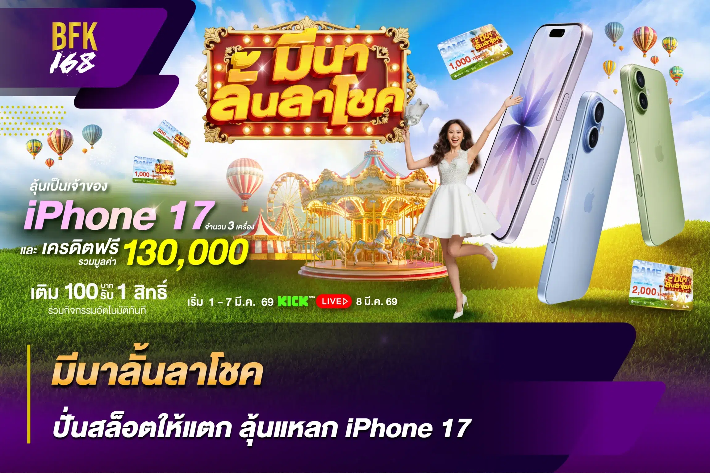 ปั่นสล็อตให้แตก ลุ้นแหลก iPhone 17 กับแคมเปญ มีนาลั้นลาโชค ที่จัดหนักต้อนรับเดือนมีนาคม! เฉพาะสมาชิกเว็บเกมออนไลน์ในเครือของเราเท่านั้น ที่จะได้ร่วมลุ้นรางวัลใหญ่ iPhone 17 ถึง 3 เครื่อง มูลค่ารวมกว่า 89,700 บาท พร้อมเครดิตฟรีอีกเพียบ รวมมูลค่ามหาศาล เฉพาะสมาชิกเว็บเดิมออนไลน์ในเครือทั้ง 8 เว็บไซต์ของเราเท่านั้นได้แก่ PIGSLOT & PIGBET HungryPussy888, 918KissME, PG168, 116Lotto และ UFABET888 เริ่ม ระหว่างวันที่ 1-7 มีนาคม และลุ้นผลสดทาง KICK Live วันที่ 8 มีนาคม 2569 นี้!